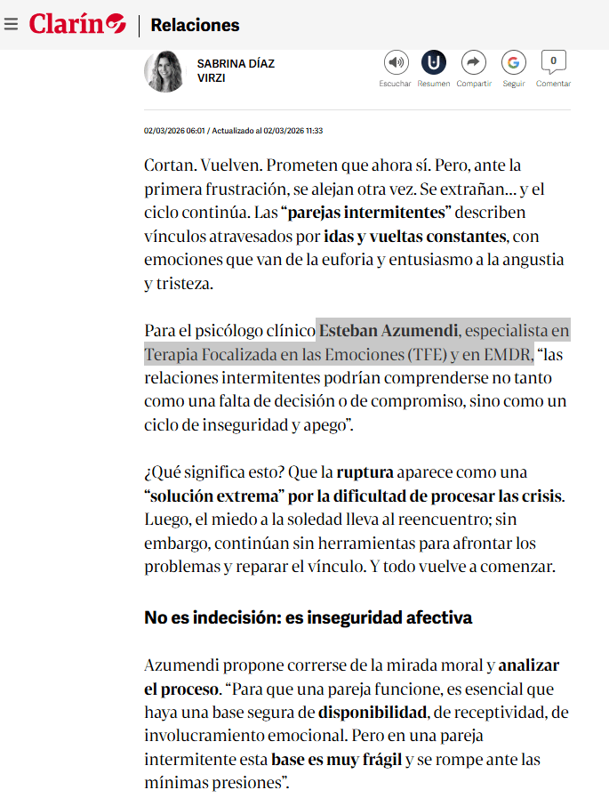 Nota reportaje en diario Clarín (2026), realizada por Sabrina Diaz Virzi. Editora sección Familia y Relaciones.